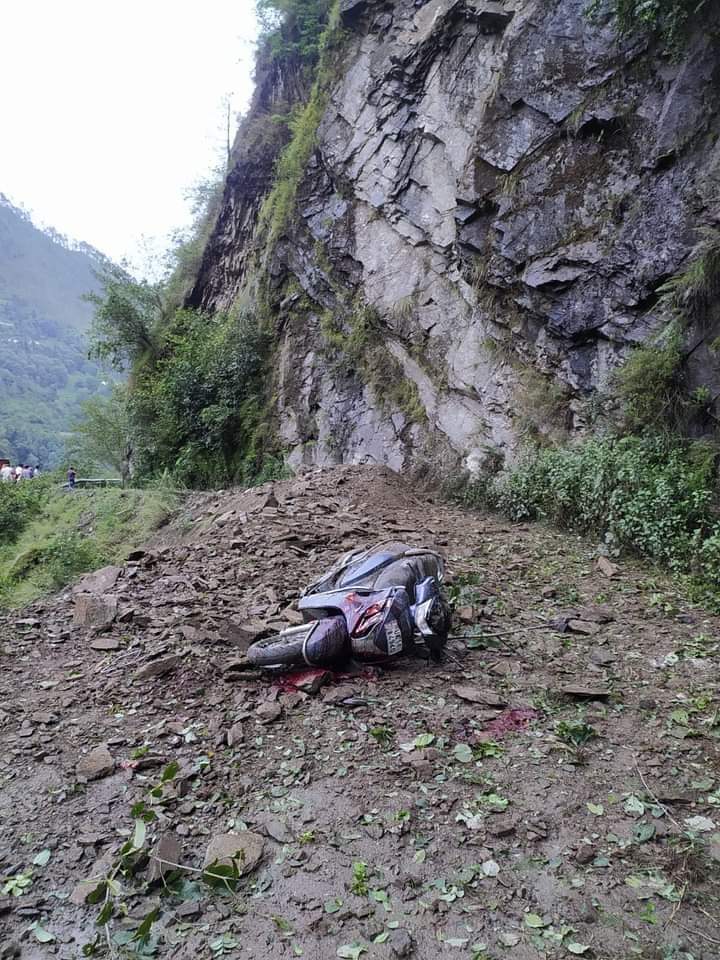 थराली देवाल मोटर मार्ग पर नंदेश्वरी के पास स्कूटी स्वरों के ऊपर गिरा बोल्डर। गोल्डन गिरने से एक स्कूटी सवार की मौके पर ही मौत हो गई जबकि दो अन्य स्कूटी सवार घायल हुए हैं।