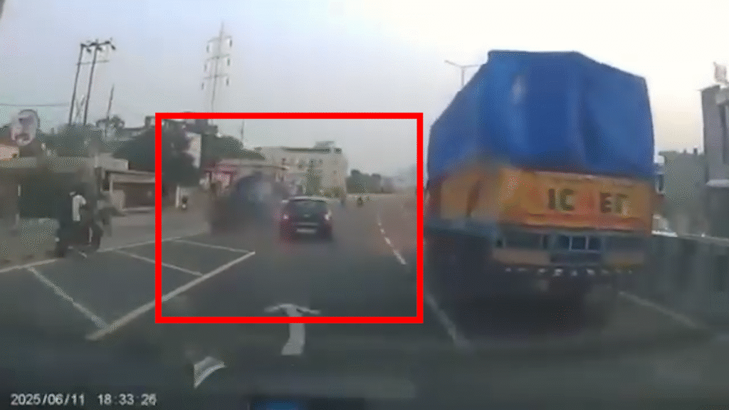 एक तेज रफ्तार कार ने टेंपो को जोरदार टक्कर मारी। कार की टक्कर से टेंपो पलट कर दूर जा गिरा। हादसे के तुरंत बाद कार सवार मौके से फरार हो गए। टेंपो में सवार कुछ लोगों को मामूली चोटें आईं है, साथ ही यह पूरा हादसा एक वाहन में लगे डैशकैम में रिकॉर्ड हो गया।