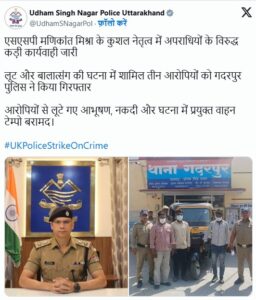 काशीपुर में महिला से चलते टेंपो में सामूहिक दुष्कर्म का मामला सामने आया, जिसके बाद पुलिस ने कड़ी कार्यवाही करते हुए आरोपियों को गिरफ्तार कर लिए है। आरोपियों से लूटे गए आभूषण, नकदी और घटना में प्रयुक्त वाहन टेम्पो बरामद किये गये।